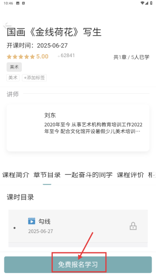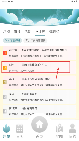 3、在學(xué)才藝課程列表里,找到國畫金線荷花寫生課程條目,點擊進(jìn)入課程詳情頁。