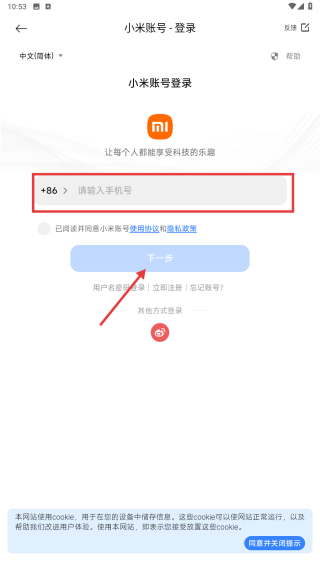 4、在小米賬號登錄頁面,輸入手機(jī)號后點(diǎn)擊下一步,完成小米賬號登錄操作。