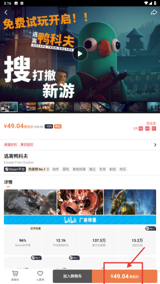 4、在游戲詳情頁,點(diǎn)擊¥49.04 折后價(jià)按鈕,完成該游戲的購買操作。
