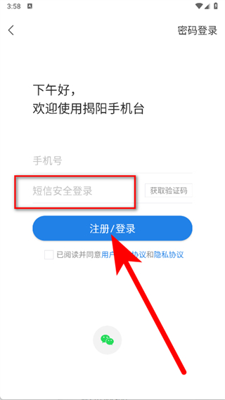 4、輸入收到的短信驗(yàn)證碼,勾選后,點(diǎn)擊注冊(cè)登錄按鈕,完成賬號(hào)登錄。