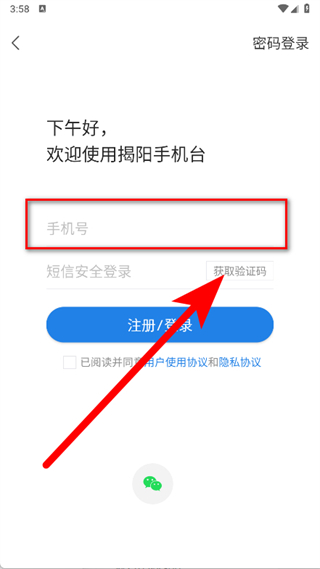 3、在登錄界面,輸入手機(jī)號(hào)碼,點(diǎn)擊獲取驗(yàn)證碼。