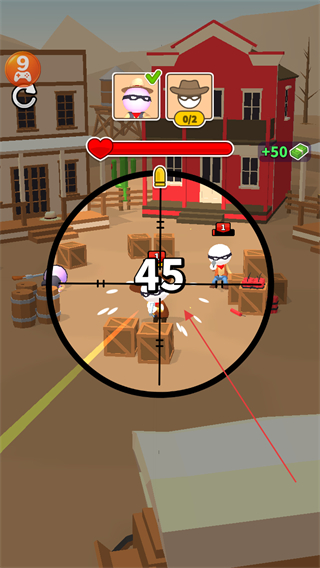1、在西部小鎮(zhèn)場(chǎng)景中,瞄準(zhǔn)目標(biāo)敵人,準(zhǔn)備執(zhí)行合約任務(wù)。
