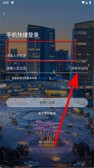 3、在登錄界面,輸入手機(jī)號(hào)碼,點(diǎn)擊獲取驗(yàn)證碼。