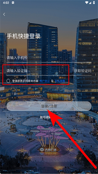 4、輸入收到的短信驗(yàn)證碼,勾選后,點(diǎn)擊登錄注冊(cè)按鈕,完成注冊(cè)登錄。