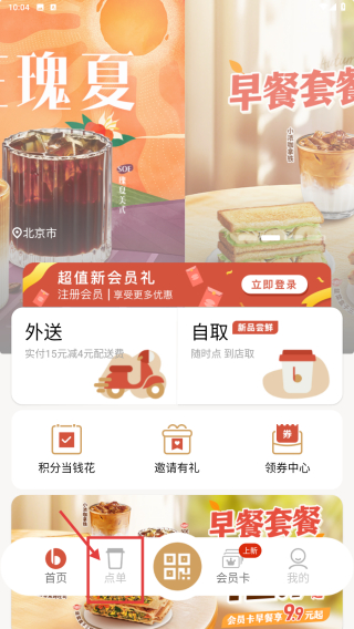 1、打開咖啡類應(yīng)用,點(diǎn)擊底部點(diǎn)單選項(xiàng),進(jìn)入堂食/外帶頁面。