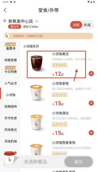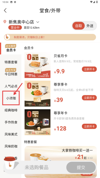 2、在堂食/外帶頁面,點(diǎn)擊小濃咖分類選項(xiàng),瀏覽小濃咖系列商品列表。