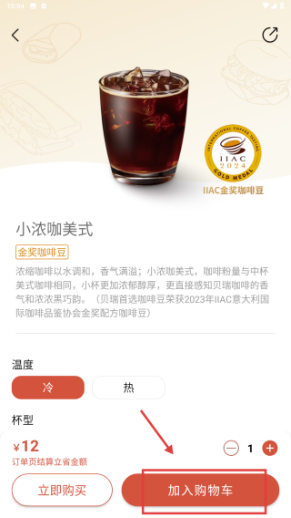 3、在商品列表里,找到小濃咖美式商品條目,點(diǎn)擊進(jìn)入商品詳情頁。