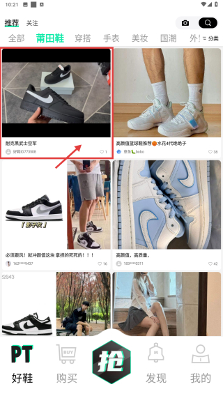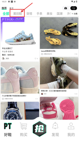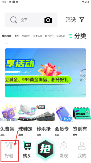 1、打開購物類應(yīng)用,點擊底部PT好鞋選項,進入商品分類頁面。