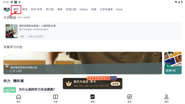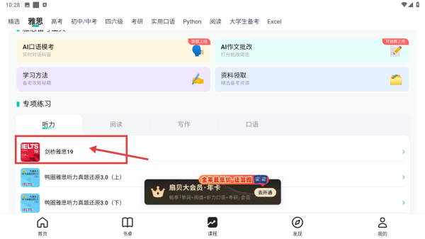 2、在課程頁(yè)面,點(diǎn)擊雅思分類(lèi)選項(xiàng),瀏覽雅思學(xué)習(xí)資源列表。