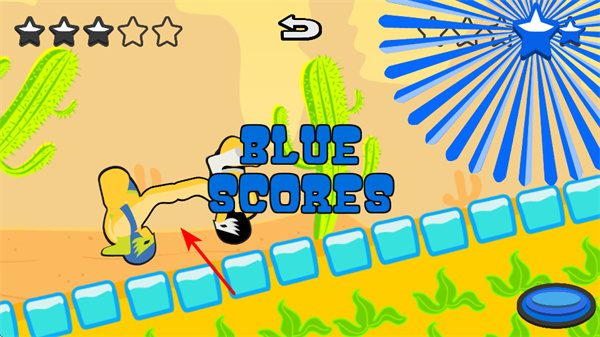 3、在摔跤對(duì)決中,成功將對(duì)手壓制并使其觸碰邊界外區(qū)域,如藍(lán)色角色得分時(shí)會(huì)有BLUE SCORES提示,助力勝利。