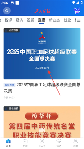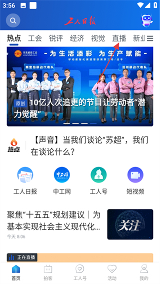 1、打開工人日報,在首頁點擊直播,即可進入直播分類頁面。
