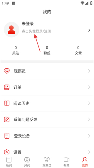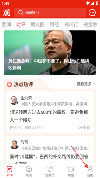 1、打開觀察者網(wǎng),點(diǎn)擊頁面右下角我的,可進(jìn)入個(gè)人中心頁面。