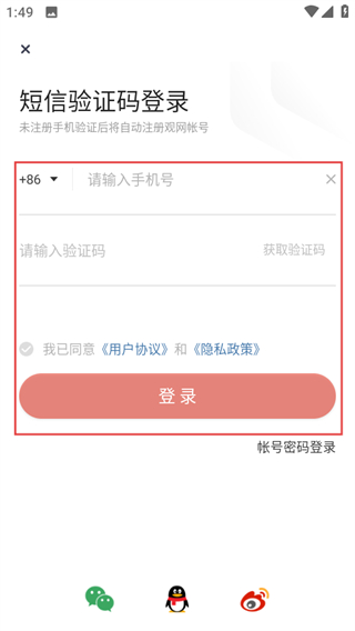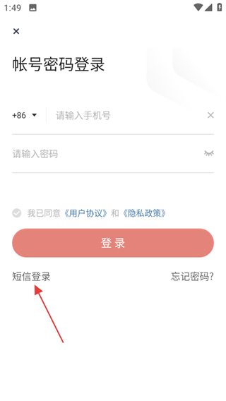 3、在登錄頁面,點(diǎn)擊短信登錄可進(jìn)入短信驗(yàn)證碼登錄頁面。