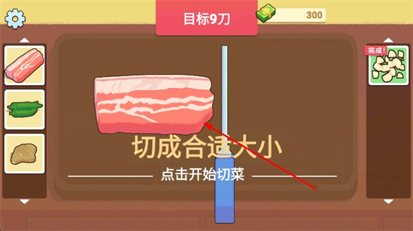 3、將食物拖到砧板上后,點(diǎn)擊屏幕即可開(kāi)始切菜,根據(jù)上方提示完成。