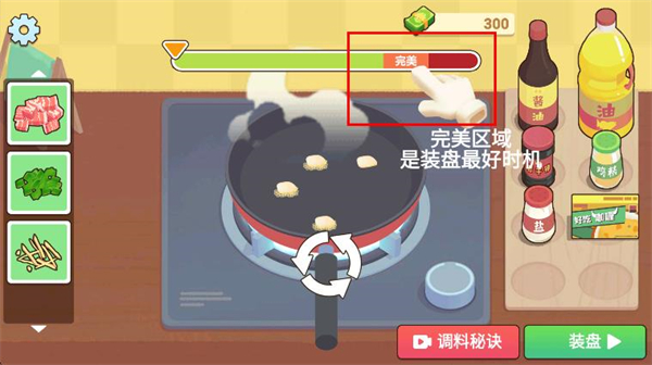 4、將食材放入鍋中開(kāi)始烹飪,注意上方的進(jìn)度條,到達(dá)完美時(shí)點(diǎn)擊裝盤(pán)。
