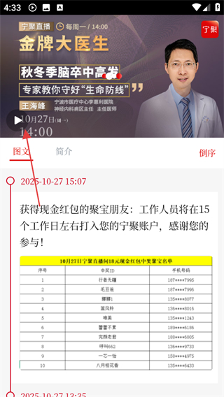 3、在直播詳情頁面,點(diǎn)擊播放按鈕可觀看直播回放內(nèi)容。