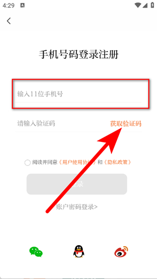 3、在登錄注冊(cè)頁(yè)面,輸入11位手機(jī)號(hào),點(diǎn)擊獲取驗(yàn)證碼。