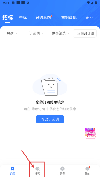 1、打開招投標(biāo)APP,點(diǎn)擊底部搜索選項(xiàng),進(jìn)入發(fā)現(xiàn)更多商機(jī)頁面。