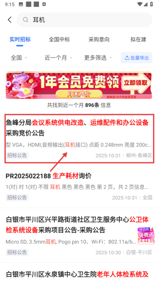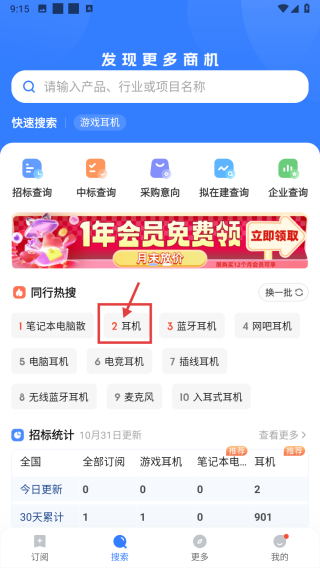 2、在發(fā)現(xiàn)更多商機(jī)頁面,點(diǎn)擊同行熱搜里的耳機(jī)選項(xiàng),查看耳機(jī)相關(guān)招標(biāo)信息。