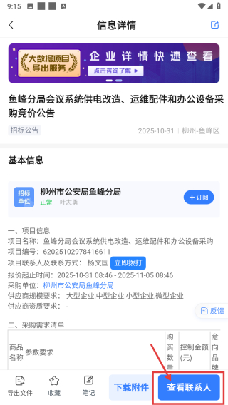 4、在信息詳情頁,點(diǎn)擊查看聯(lián)系人按鈕,獲取該項(xiàng)目聯(lián)系人信息。