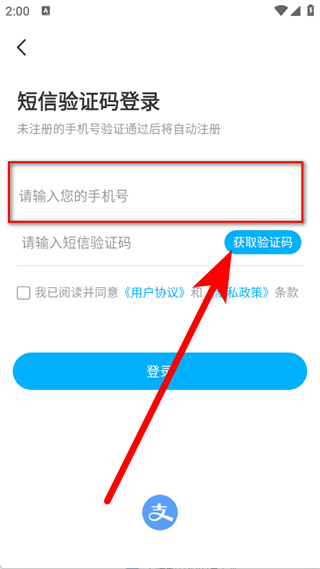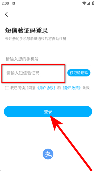4、輸入短信驗(yàn)證碼,勾選用戶協(xié)議后,點(diǎn)擊登錄,完成賬號(hào)登錄。