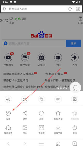 1、打開私密瀏覽器進(jìn)入主界面,向下滑動界面找到并點擊設(shè)置圖標(biāo),進(jìn)入瀏覽器的設(shè)置頁面。