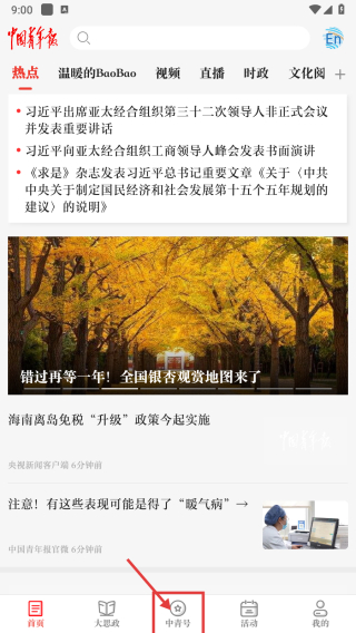 1、打開中國青年報(bào),點(diǎn)擊底部的中青號選項(xiàng)。