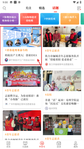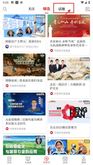 2、在中青號中點(diǎn)擊右上角的話題選項(xiàng)。