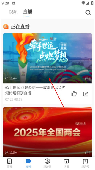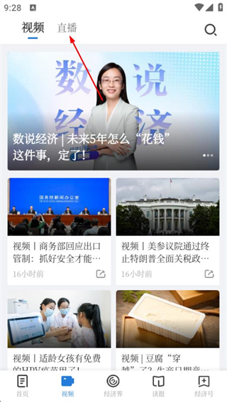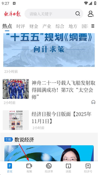 1、打開經(jīng)濟(jì)日報(bào),在首頁點(diǎn)擊視頻,可進(jìn)入視頻分類頁面。
