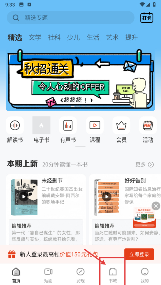 1、打開閱讀類APP首頁,點擊底部書城選項,進(jìn)入書城頁面。