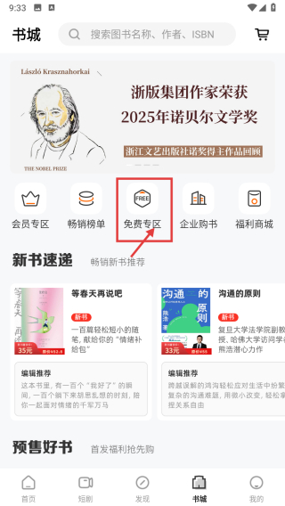 2、在書城頁面,點擊免費專區(qū)選項,進(jìn)入免費專區(qū)圖書列表頁面。