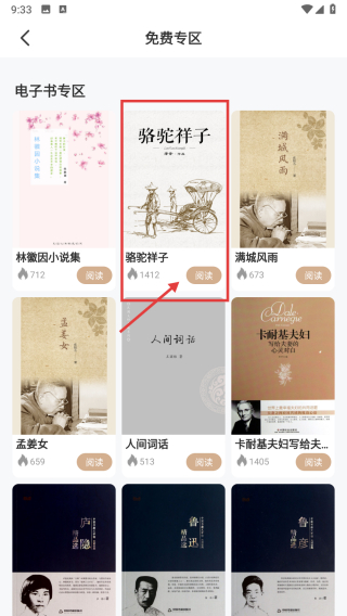 3、在免費專區(qū)圖書列表中,點擊駱駝祥子條目,進(jìn)入圖書詳情頁。