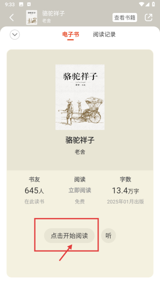 4、在圖書詳情頁,點擊點擊開始閱讀按鈕,開始閱讀駱駝祥子。