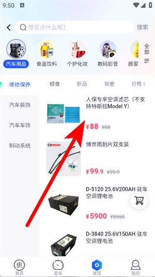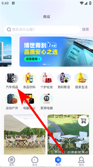 2、在發(fā)現(xiàn)頁(yè)面的商城板塊,點(diǎn)擊汽車用品,進(jìn)入汽車用品列表。