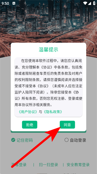 1、打開易查車,在溫馨提示彈窗中點(diǎn)擊同意。