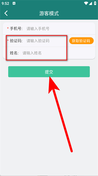 4、輸入收到的短信驗(yàn)證碼,輸入姓名后,點(diǎn)擊提交按鈕,完成游客登錄。