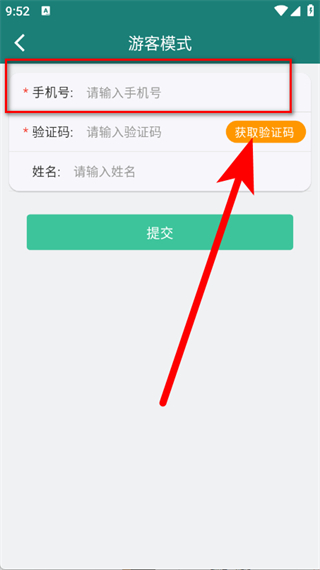 3、在游客登錄頁面,輸入手機(jī)號(hào)碼,點(diǎn)擊獲取驗(yàn)證碼。