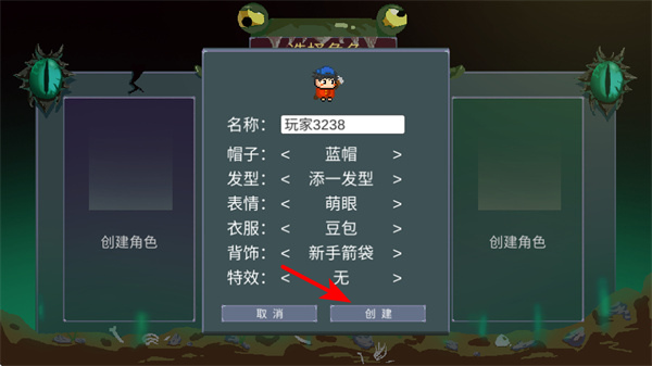 1、在角色創(chuàng)建界面,自定義名稱、帽子角色外觀后,點擊按鈕,完成創(chuàng)建是進入游戲世界的基礎(chǔ)操作。