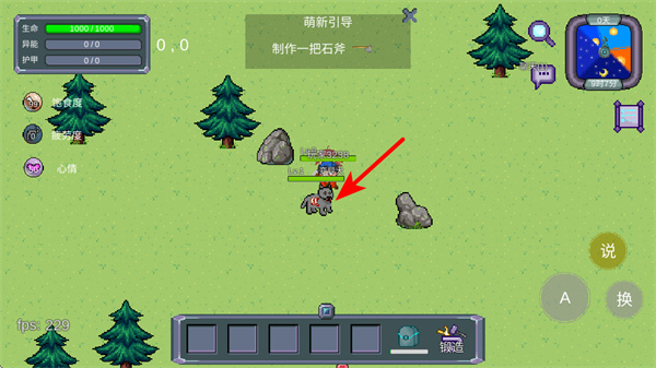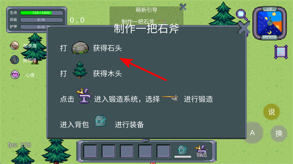 4、根據(jù)萌新引導(dǎo),通過擊打石頭獲取石頭資源,同時擊打樹木獲取木頭資源,工具做好材料準(zhǔn)備,推動進程。