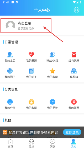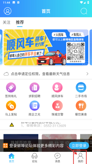 1、打開(kāi)本地論壇類(lèi)APP首頁(yè),點(diǎn)擊底部我的選項(xiàng),進(jìn)入個(gè)人中心頁(yè)面。