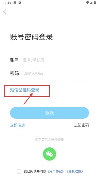 3、在登錄方式選擇頁(yè)面,點(diǎn)擊短信驗(yàn)證碼登錄選項(xiàng),進(jìn)入短信驗(yàn)證碼登錄信息填寫(xiě)頁(yè)面。