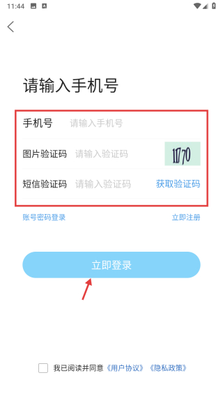 4、在短信驗(yàn)證碼登錄頁(yè)面,填寫(xiě)手機(jī)號(hào)、圖片驗(yàn)證碼及短信驗(yàn)證碼,勾選同意協(xié)議后點(diǎn)擊立即登錄按鈕,完成賬號(hào)登錄操作。