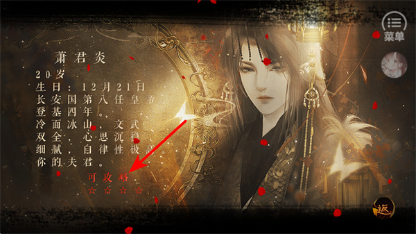 3、在角色介紹界面,可攻略標(biāo)識的角色,如蕭君炎,可攻略角色是游戲感情線的關(guān)鍵,互動可解鎖專屬劇情和結(jié)局。