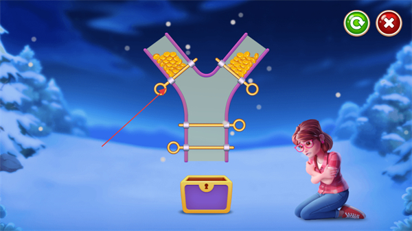 3、不同關(guān)卡的小游戲都不一樣,比如有拉動(dòng)圓環(huán)使金幣順著管道落入下方的寶箱中即為關(guān)卡勝利的關(guān)卡等。