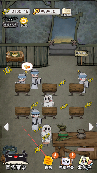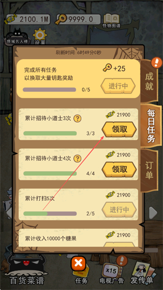 4、完成每日任務(wù)如累計(jì)招待小道士、打掃次數(shù)等,可領(lǐng)取大量糖果獎(jiǎng)勵(lì),用于兌換餐廳資源或解鎖新內(nèi)容,不斷發(fā)展壯大怪物餐廳。