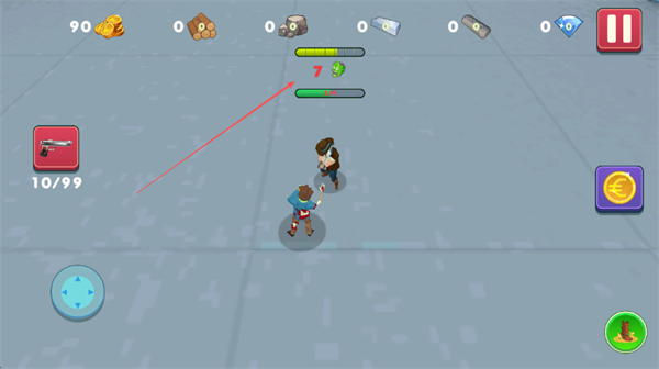 1、關(guān)注上方血量條,與隊(duì)友配合攻擊僵尸,收集金幣提升戰(zhàn)力。