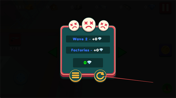 4、若戰(zhàn)斗失敗,點(diǎn)擊右下角重玩按鈕,重新挑戰(zhàn)關(guān)卡,爭取通關(guān)獲得鉆石獎(jiǎng)勵(lì)。