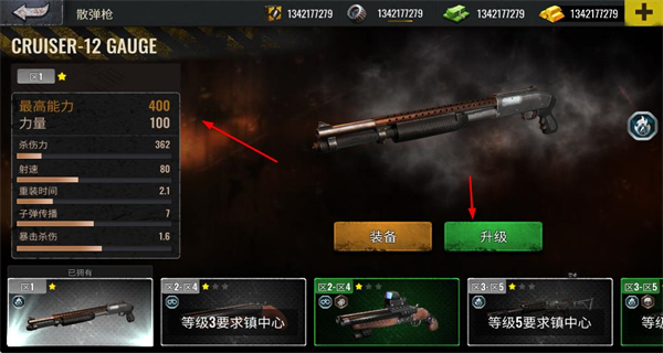 2、進(jìn)入武器界面,選擇散彈槍等點(diǎn)擊升級,提升武器屬性,為戰(zhàn)斗奠定火力基礎(chǔ)。