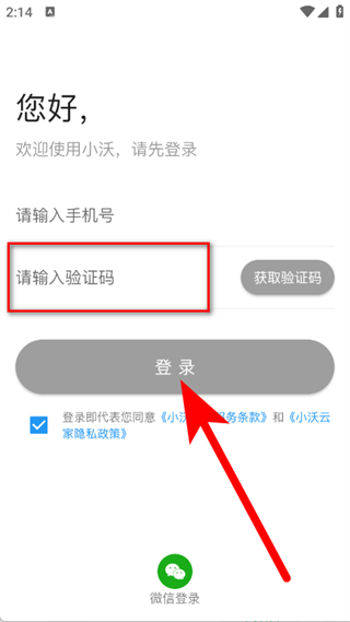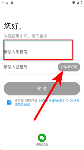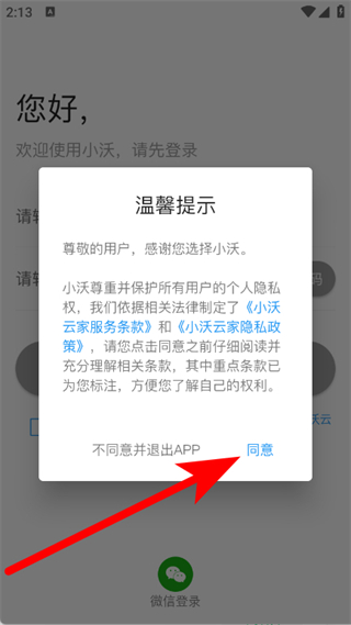 1、打開小沃云家,在彈窗中點擊同意,進入登錄頁面。