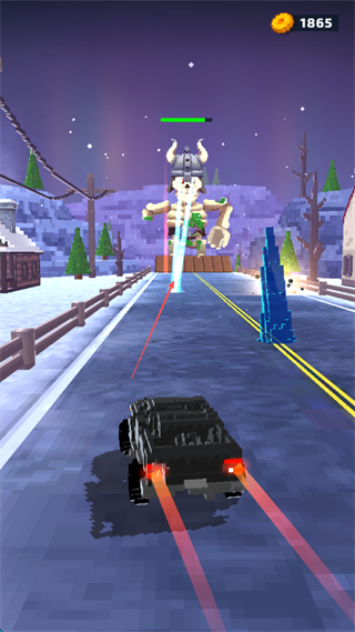 1、駕駛車(chē)輛發(fā)射藍(lán)色光束攻擊巨型骷髏敵人,持續(xù)消耗其血量。